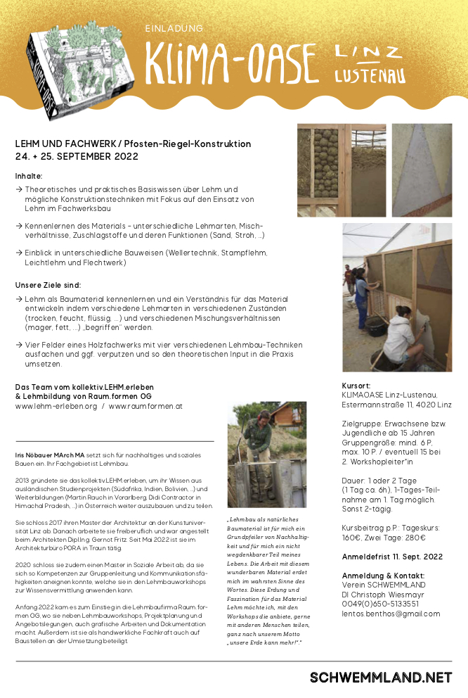 Diesen September dürfen wir in der Klimaoase unseren ersten und hoffentlich nicht letzten Lehmbauworkshop veranstalten. Der neugebaute Pavillon erhält eine Rückwand aus unterschiedlichen Techniken, die wir dann auch verputzen.