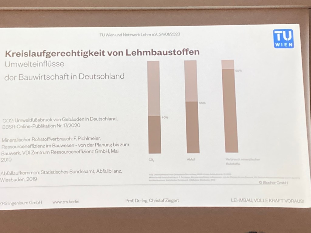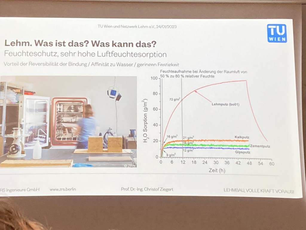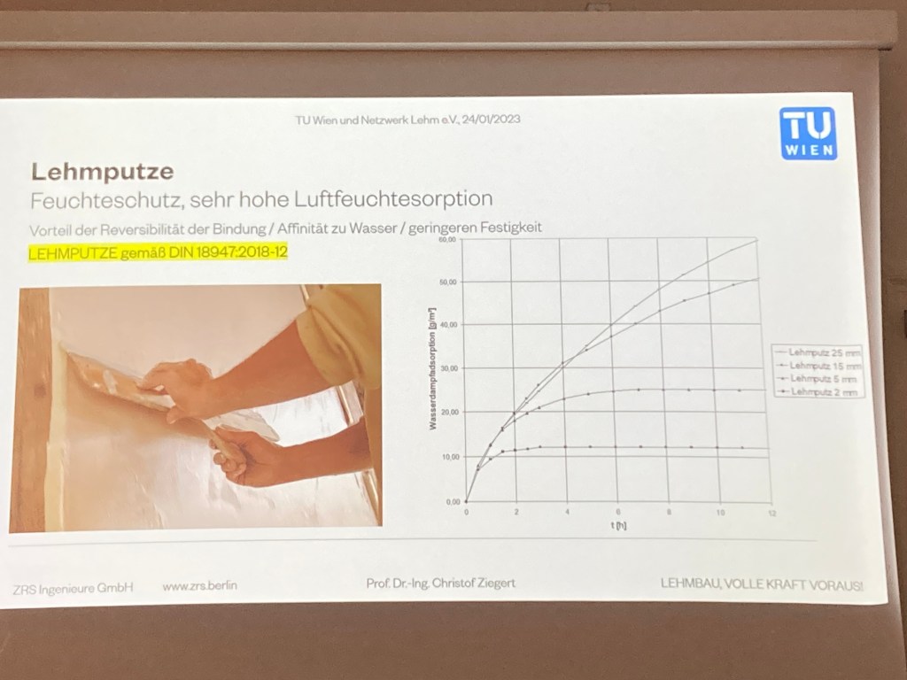 Der Vortrag war dann echt spannend! Wahnsinnig weitreichend von der Geschichte des Lehmbaus, über die aktuellen Normen und Neuerungen, sowie Projekten bis hin zu statistischen Auswertungen der Vor-und Nachteile von Anwendungsbeispielen. Also warme Empfehlung meinerseits: www.zrs.berlin. Schaut mal bei denen vorbei, die machen tolle Sachen. Hab’s sogar kurz geschafft mich mit Christof zu unterhalten und ihm unsere Visitenkarte mitzugeben. Danke an dieser Stelle an Jasmin, die uns vorgestellt hat.