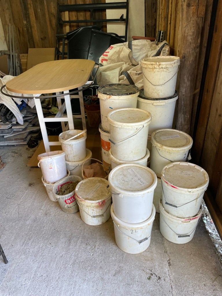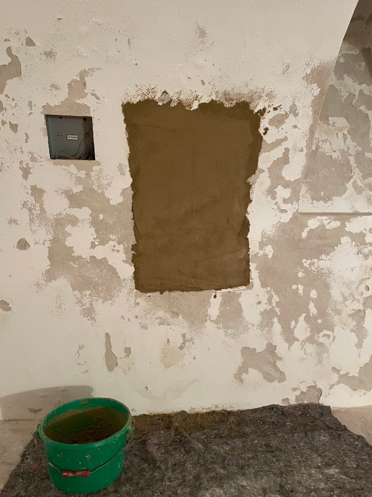 Nun ging es daran, alles vorzubereiten: Also ausräumen, sortieren, putzen und einräumen und einrichten. Eine Probe-Putzfläche wurde angelegt, um zu sehen, ob die Wand nur feucht ist, oder sich auch Salze im bestehenden Putz / Mauerwerk befinden. Ein optimaler Test zu Ansicht für zukünftige Kursbesucher*innen, um sich mit Altsubstanzen auseinanderzusetzen.