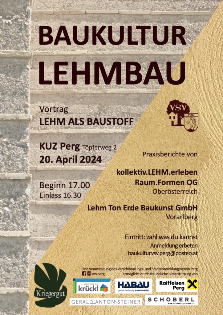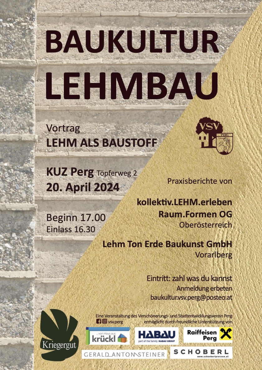 Wie schon angekündigt dürfen wir gemeinsam mit LehmTonErde Baukunst GmbH in Perg einen Abend zum Thema „Lehm als Baustoff“ gestalten!