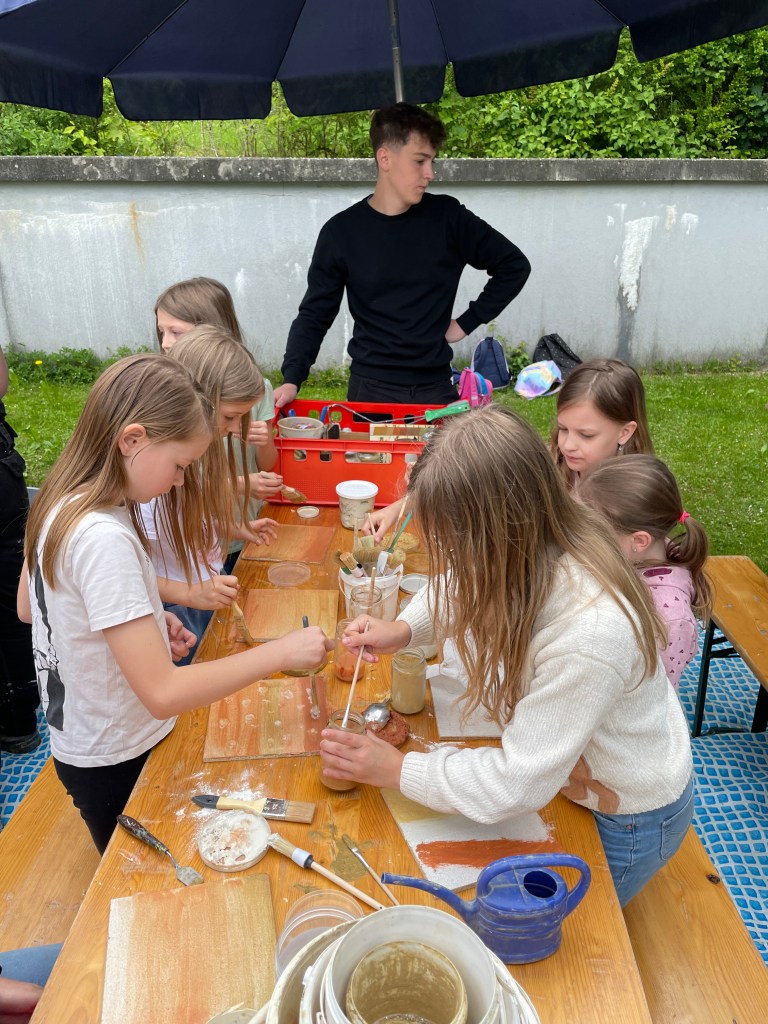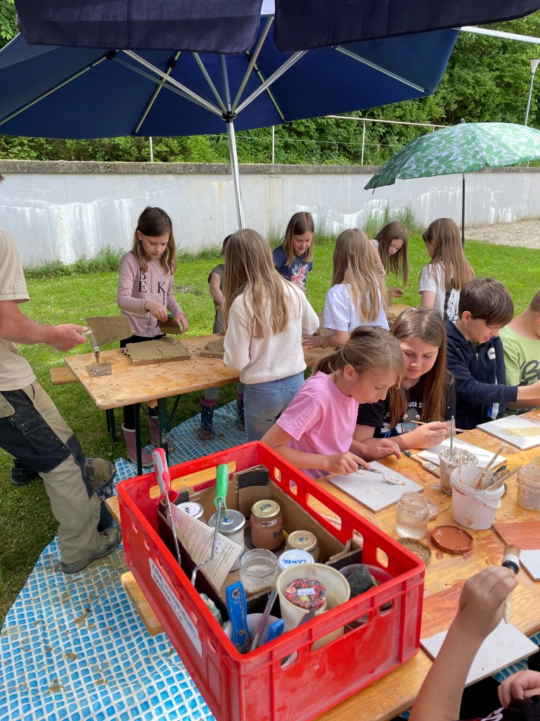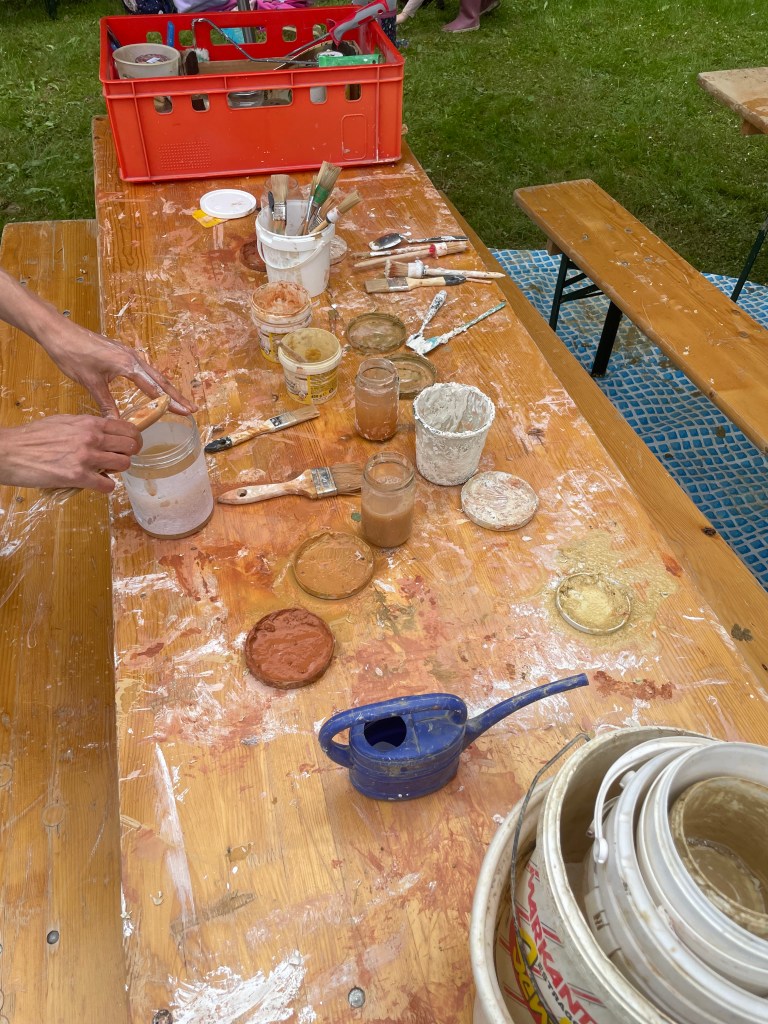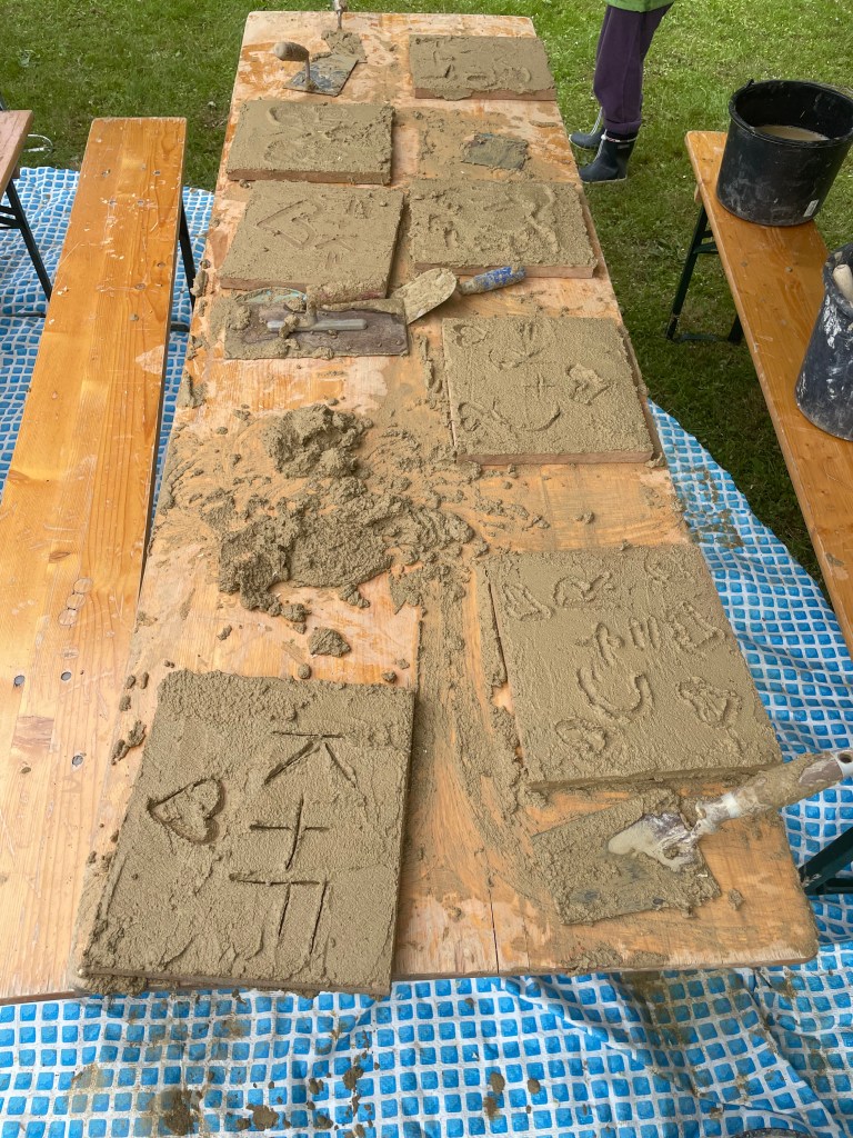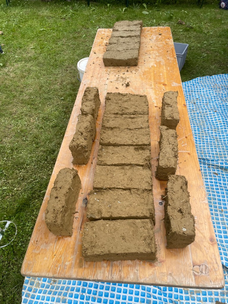 Jeweils 30 Minuten konnte dann pro Station ausprobiert; also gemalt, verputzt, gemischt und gestopft (in die Ziegelschalungen) werden. Bis es weiter zur nächsten Station ging. Unzählige Lehmbilder und Lehmputz-Muster sind so entstanden, welche die Kinder als Erinnerung mitnehmen durften, und für unser nächstes Bauprojekt haben 20 neue Lehmziegel hergestellt.