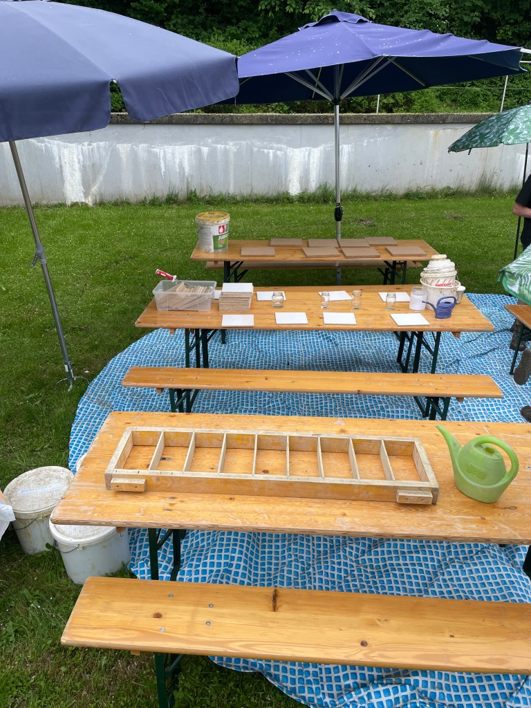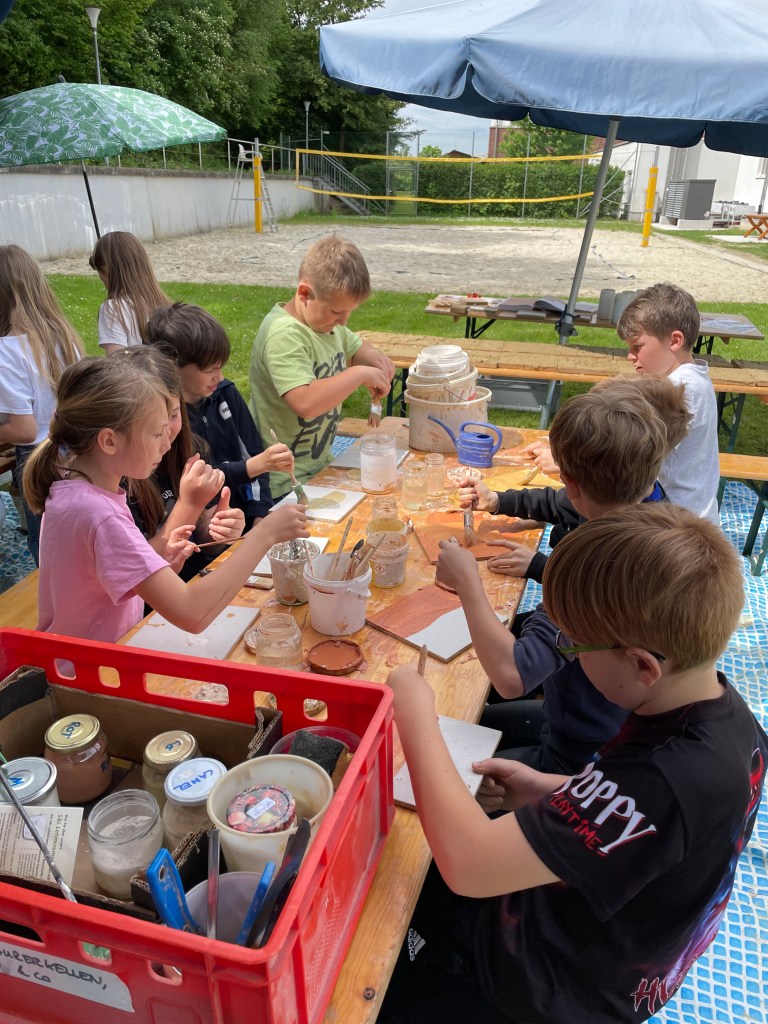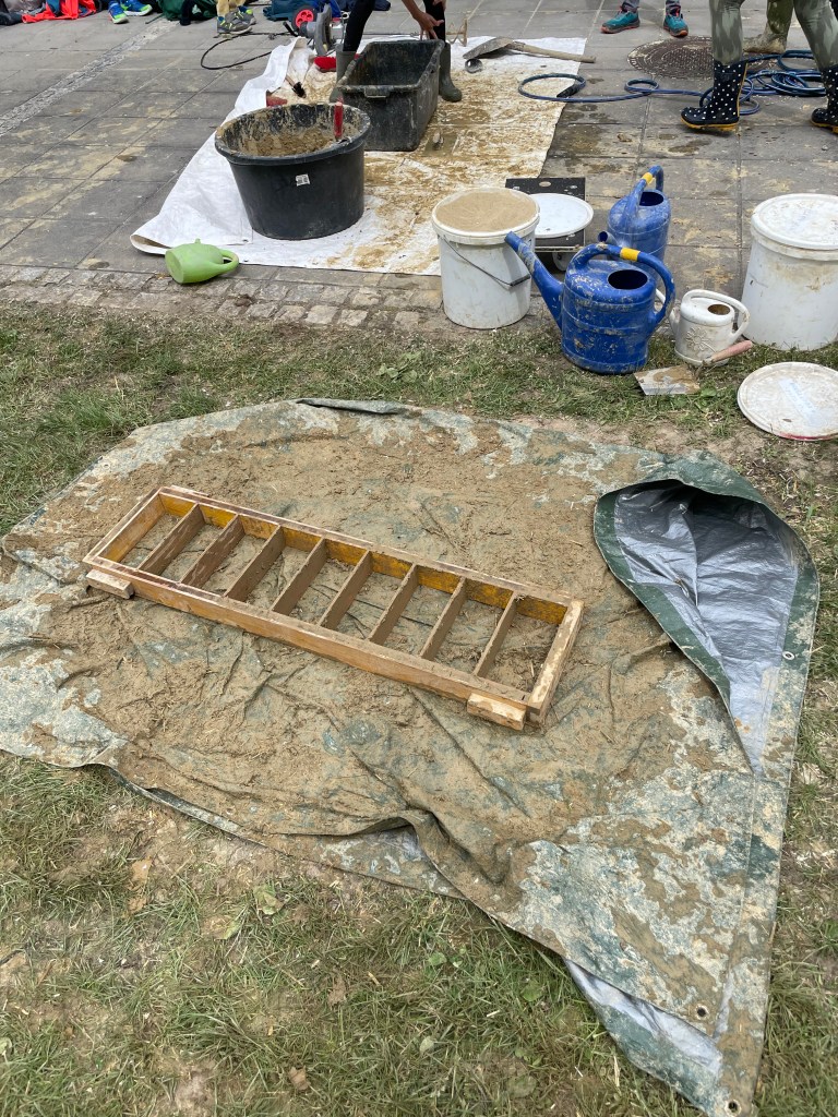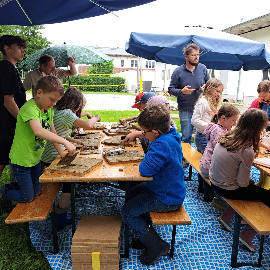 Jeweils 30 Minuten konnte dann pro Station ausprobiert; also gemalt, verputzt, gemischt und gestopft (in die Ziegelschalungen) werden. Bis es weiter zur nächsten Station ging. Unzählige Lehmbilder und Lehmputz-Muster sind so entstanden, welche die Kinder als Erinnerung mitnehmen durften, und für unser nächstes Bauprojekt haben 20 neue Lehmziegel hergestellt.