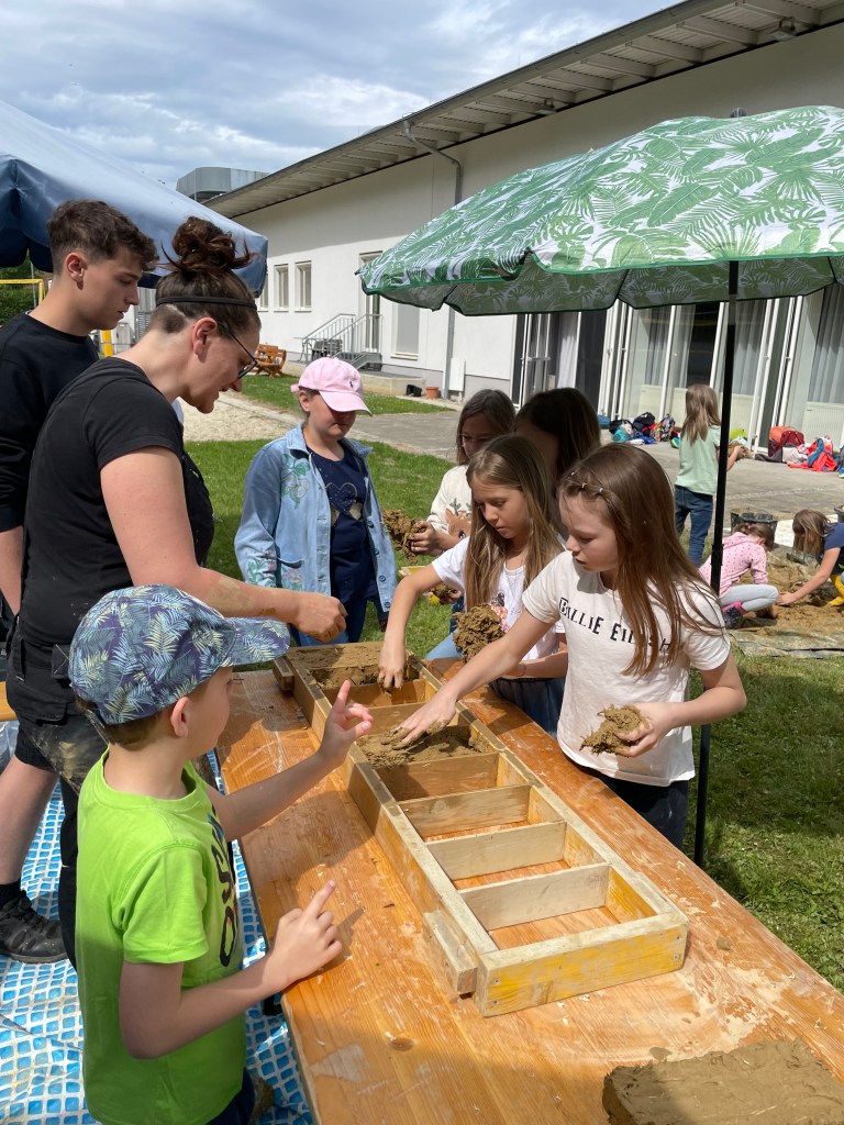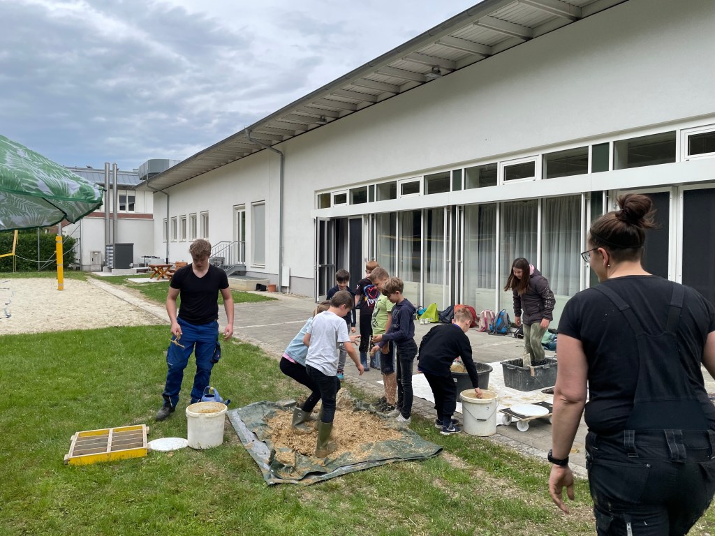 Die Kinder wurden in drei Gruppen aufgeteilt. Iris betreute die Lehmziegelproduktion (Station 1), Roli zeigte, wie Lehmputz aufgetragen wird (Station 2) und Jasmin sorgte für die gewünschte (Lehm-)Farbe (Station 3).