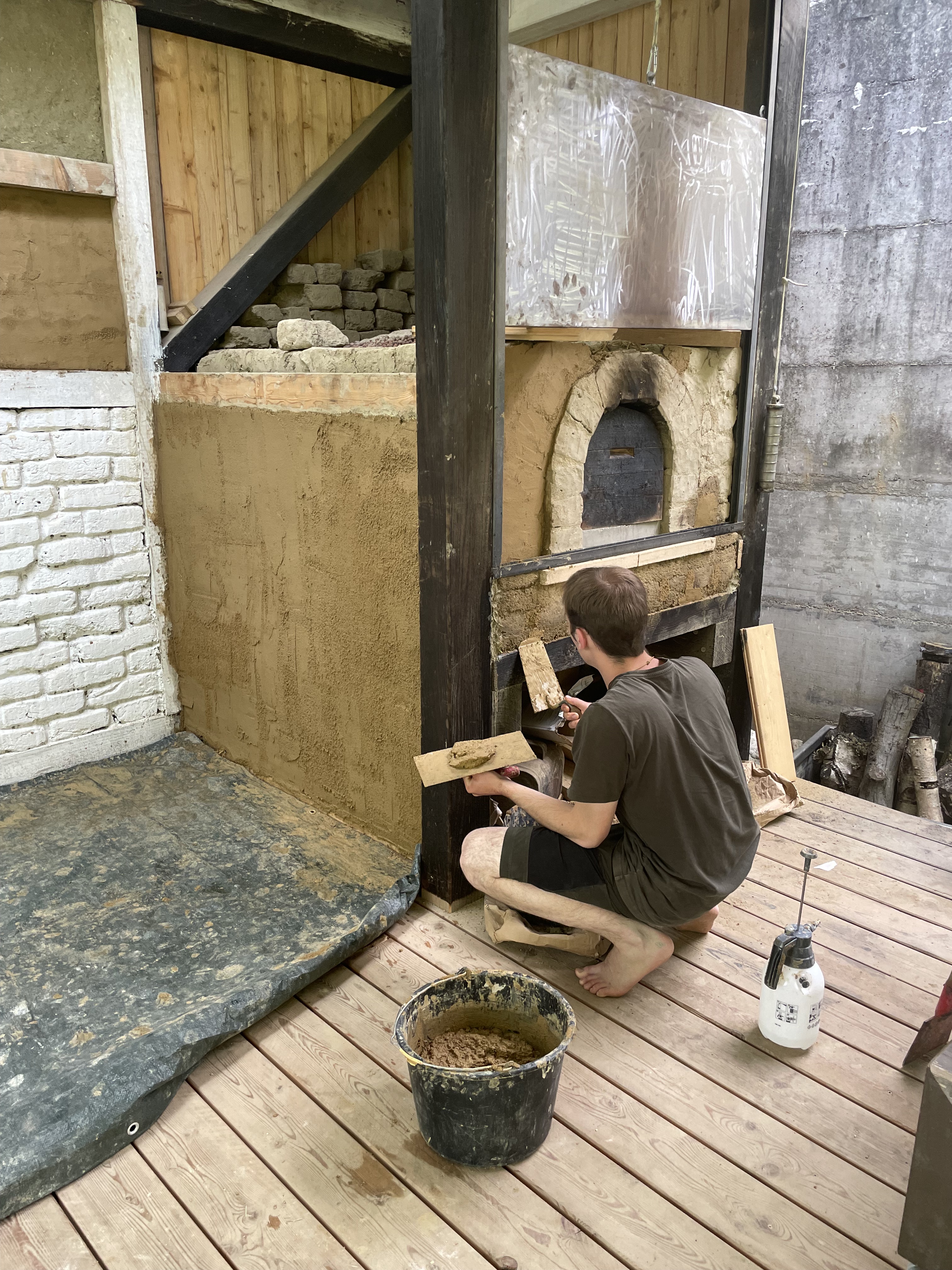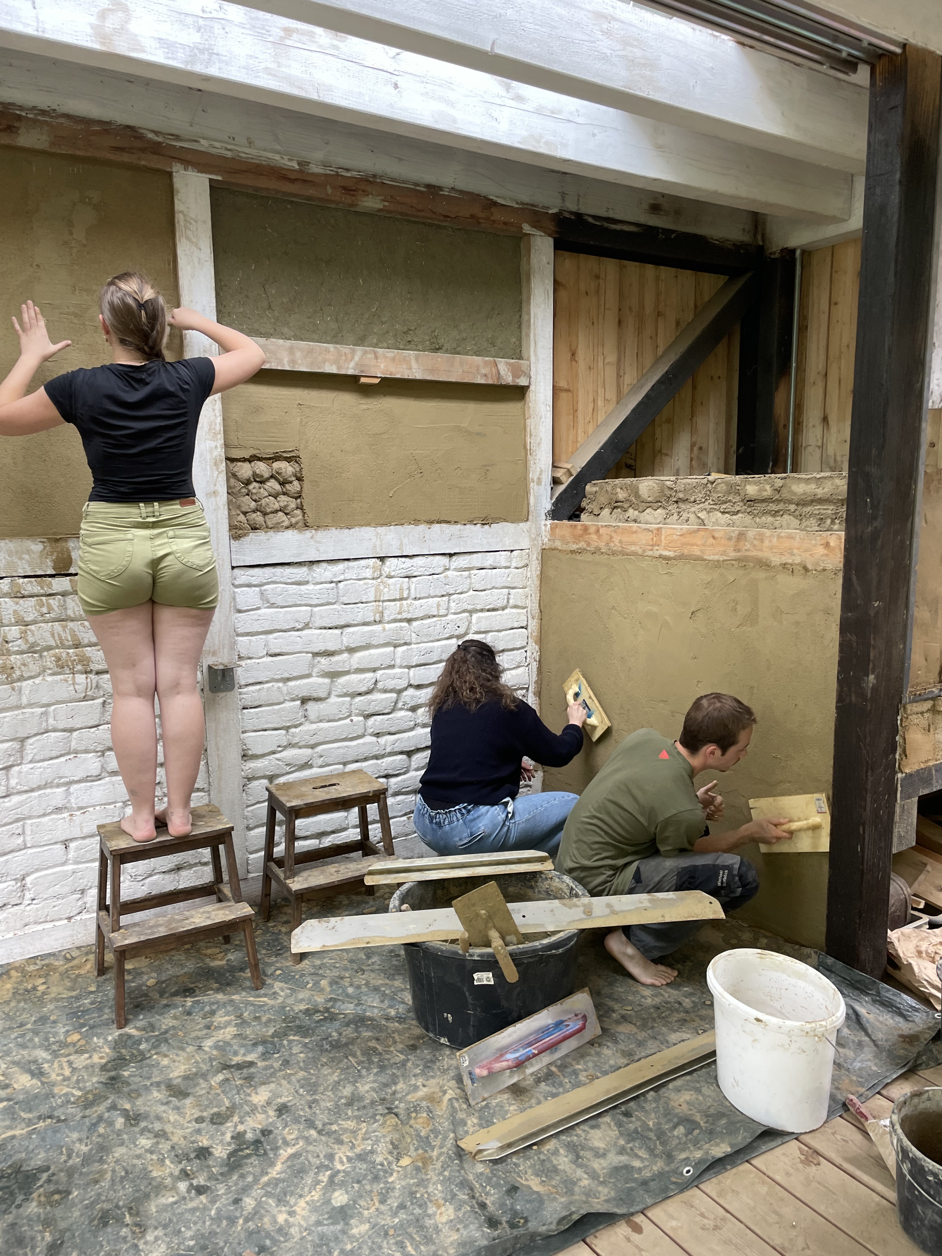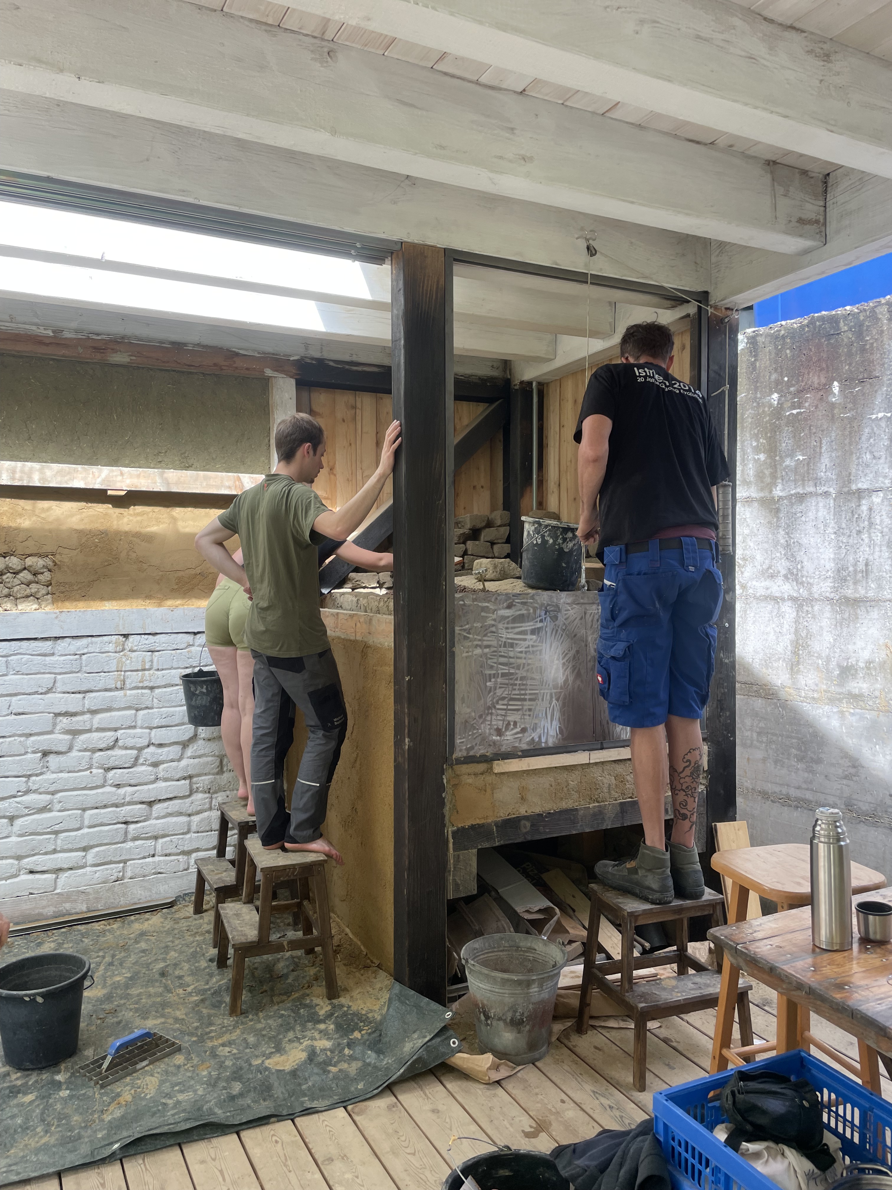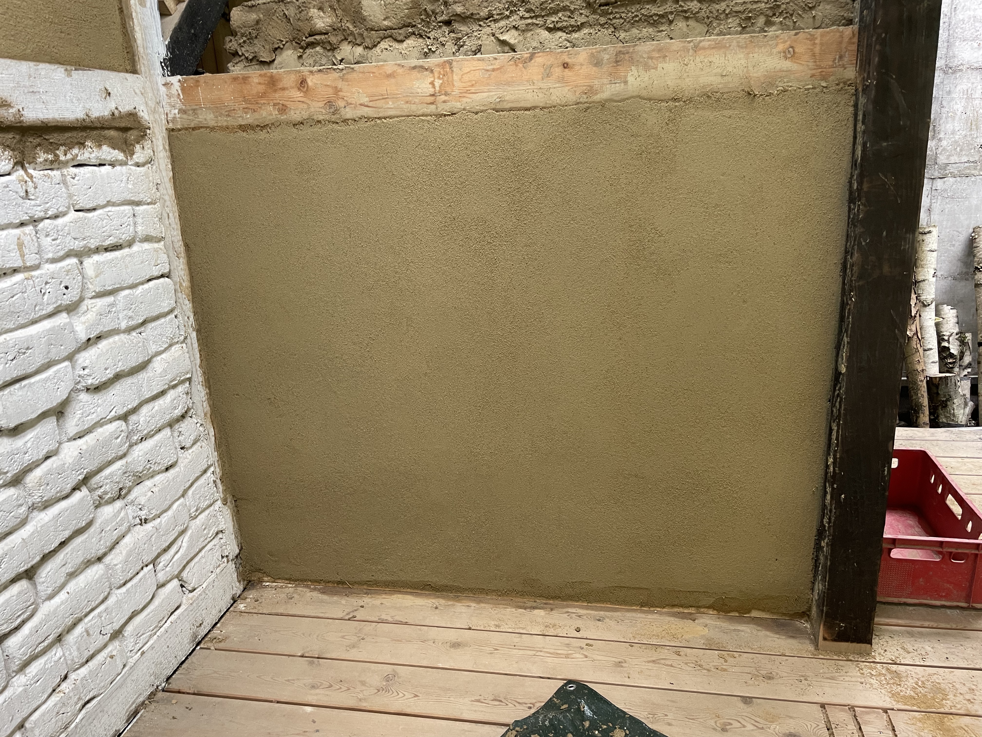 Die perfekte Überleitung zur Materialkunde: Was ist Lehm eigentlich genau? Woraus besteht er und was sind die Besonderheiten? Zwischendurch wurden ersten Mischungen erstellt und aufgetragen. Nach dem Mittagessen – selbstgemachter Pizza aus dem LEHMOFEN! – und einer kurzen Pause ging es schon wieder weiter mit Werkzeugkunde, bevor diese getestet werden konnten. Am Ende des ersten Tags war die erste Putzschicht auf der Wand und viel Theorie in den Köpfen. 🤯