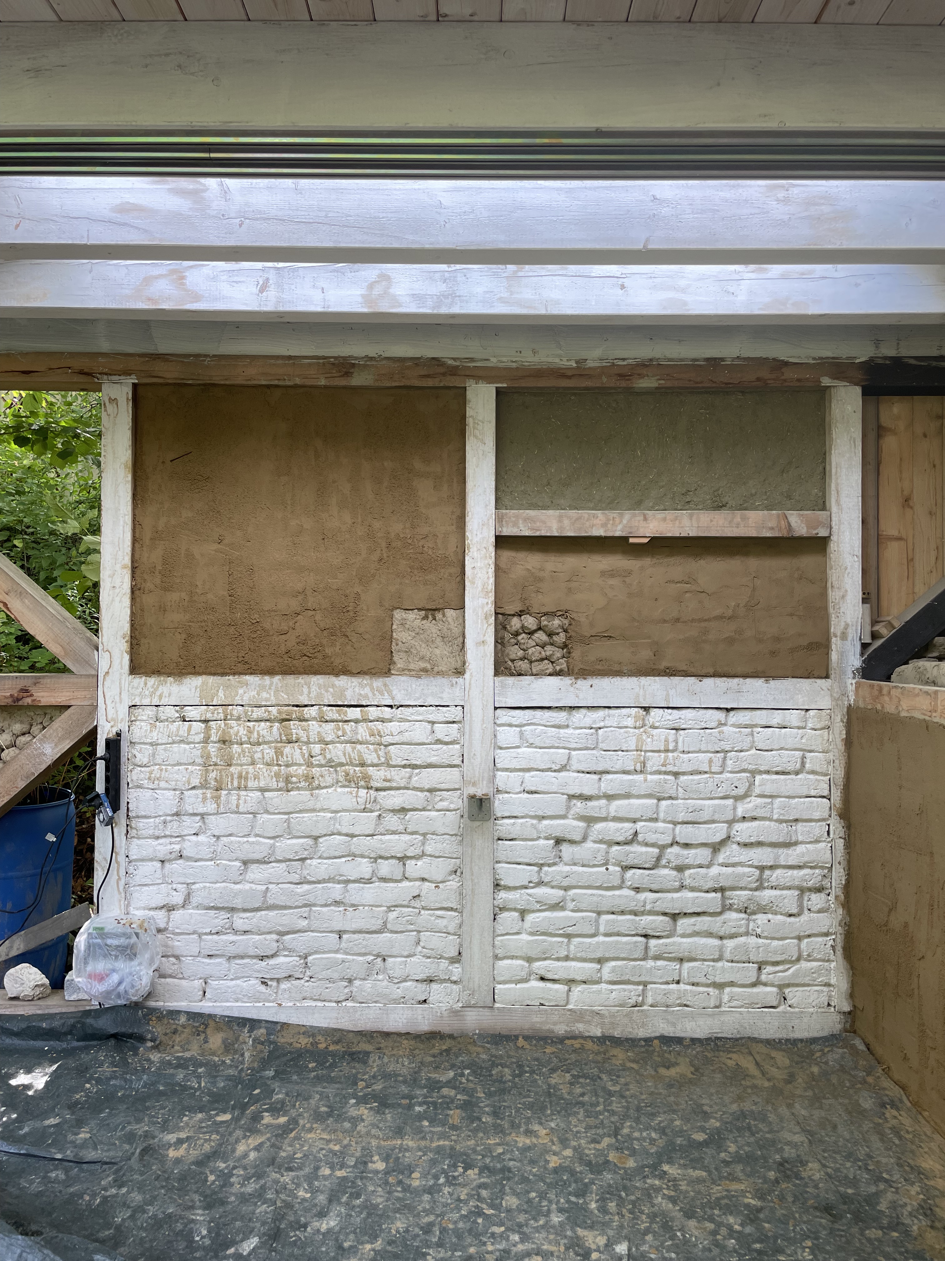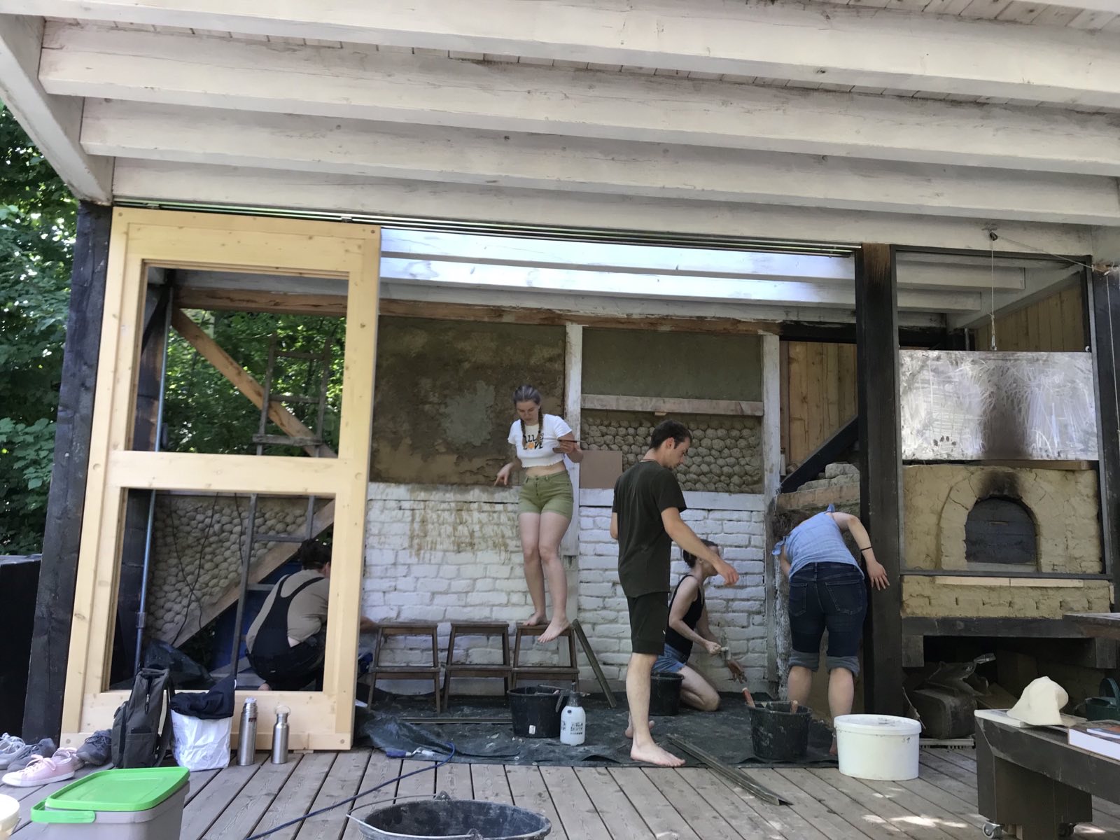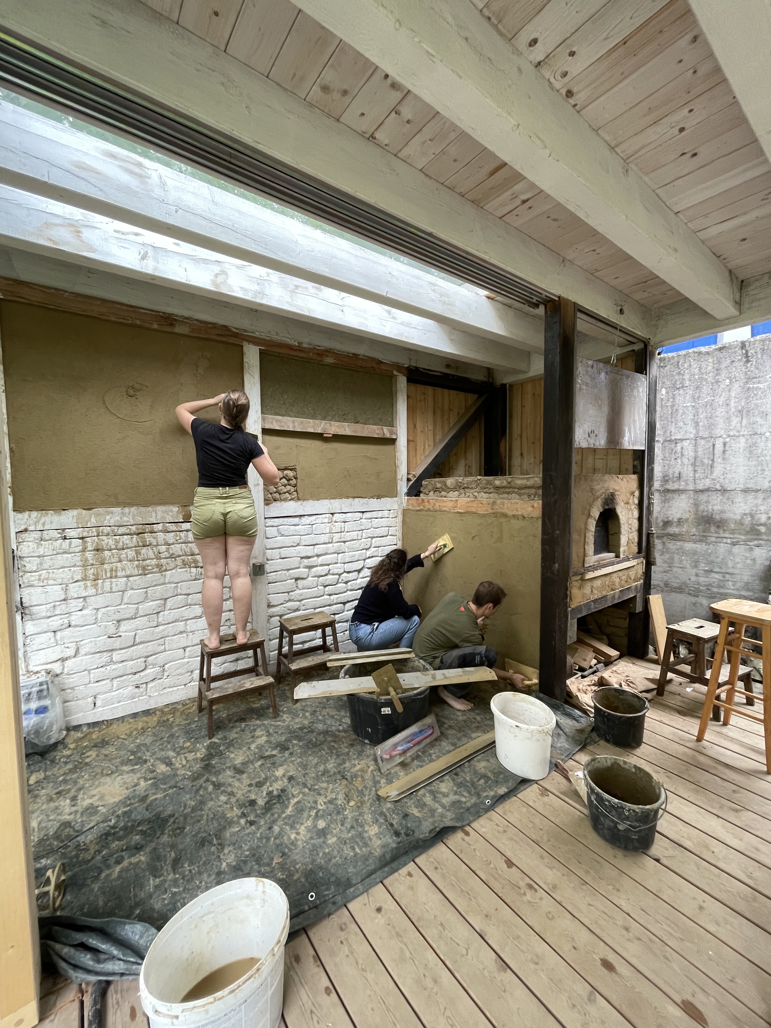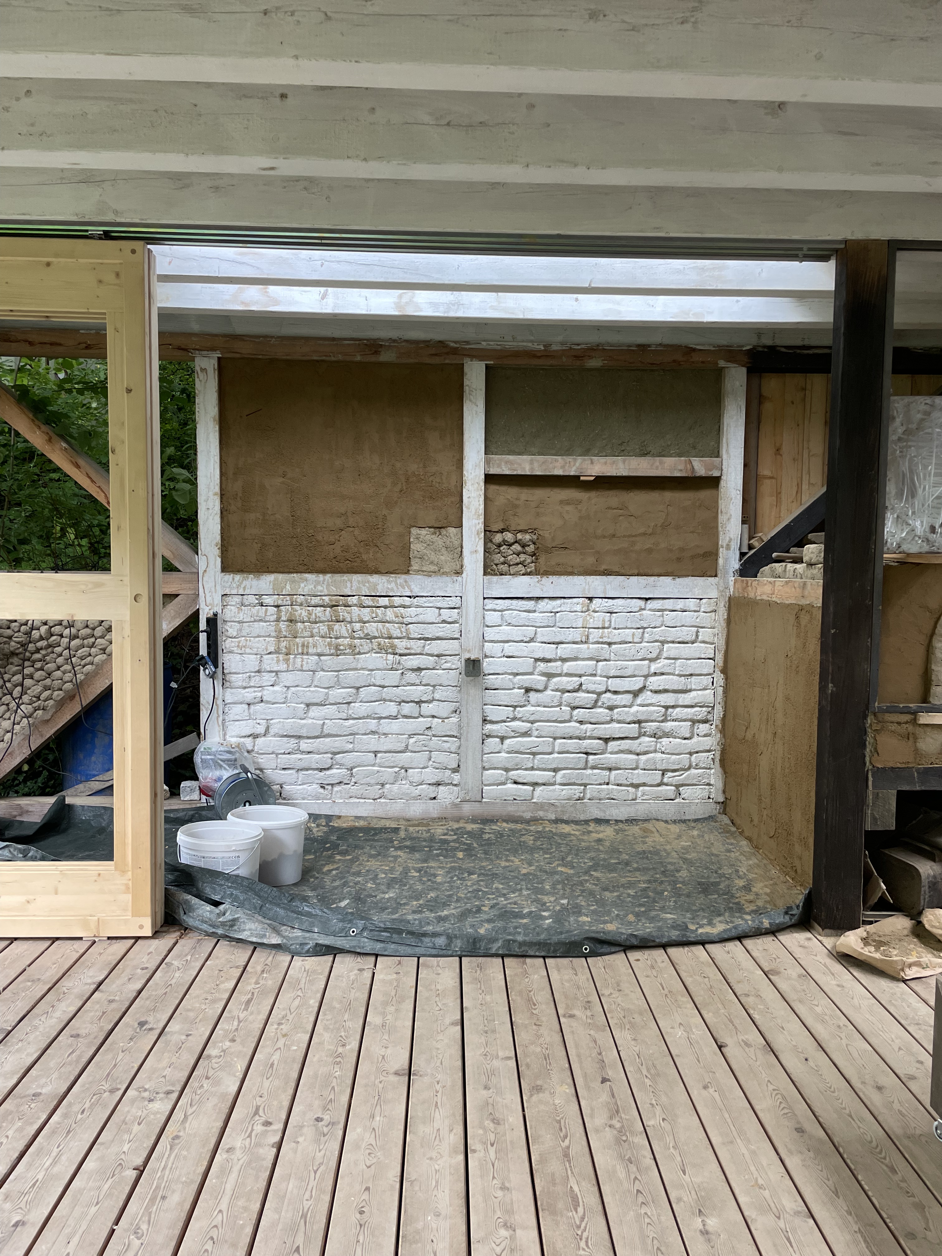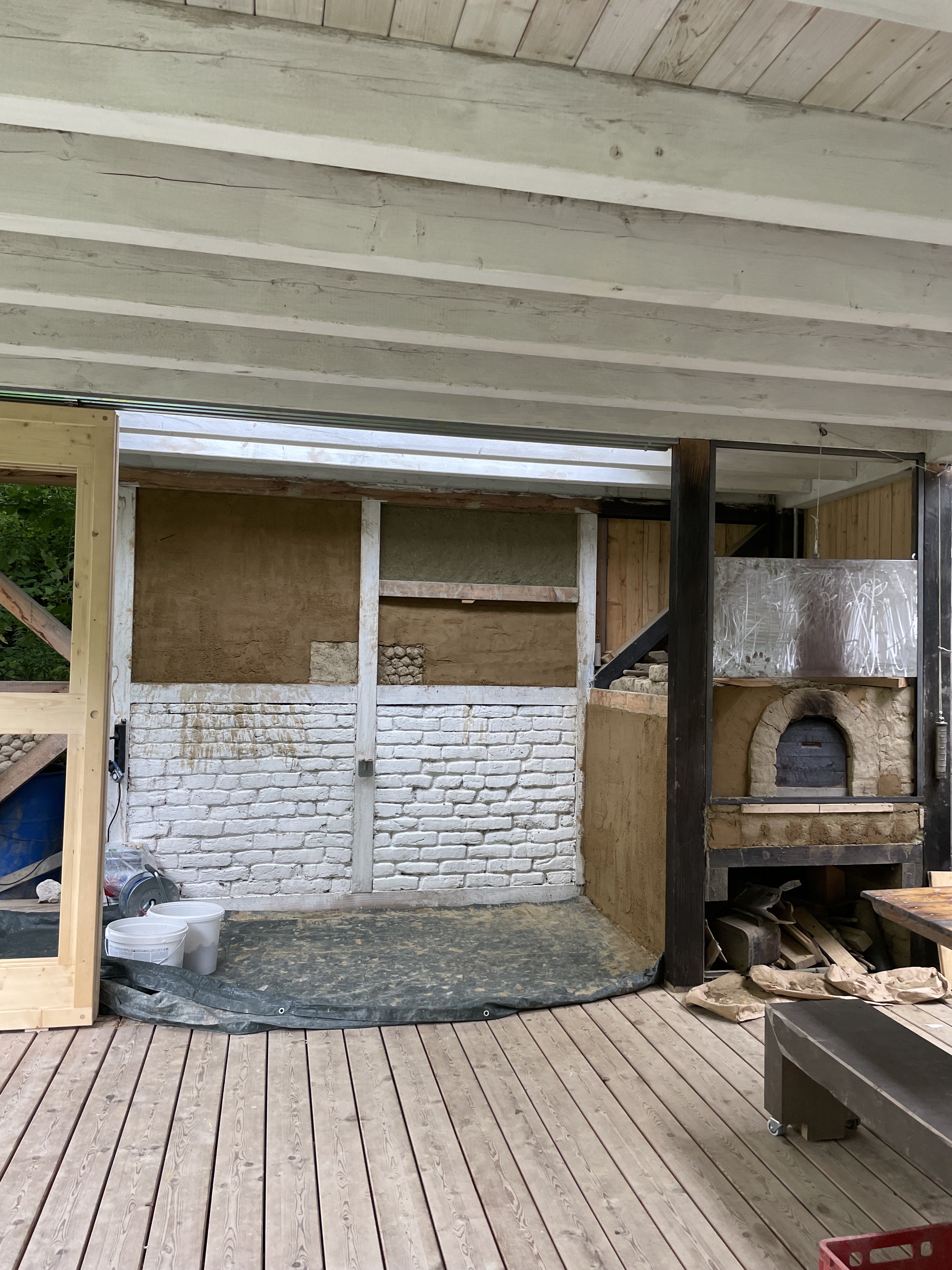 Die perfekte Überleitung zur Materialkunde: Was ist Lehm eigentlich genau? Woraus besteht er und was sind die Besonderheiten? Zwischendurch wurden ersten Mischungen erstellt und aufgetragen. Nach dem Mittagessen – selbstgemachter Pizza aus dem LEHMOFEN! – und einer kurzen Pause ging es schon wieder weiter mit Werkzeugkunde, bevor diese getestet werden konnten. Am Ende des ersten Tags war die erste Putzschicht auf der Wand und viel Theorie in den Köpfen. 🤯