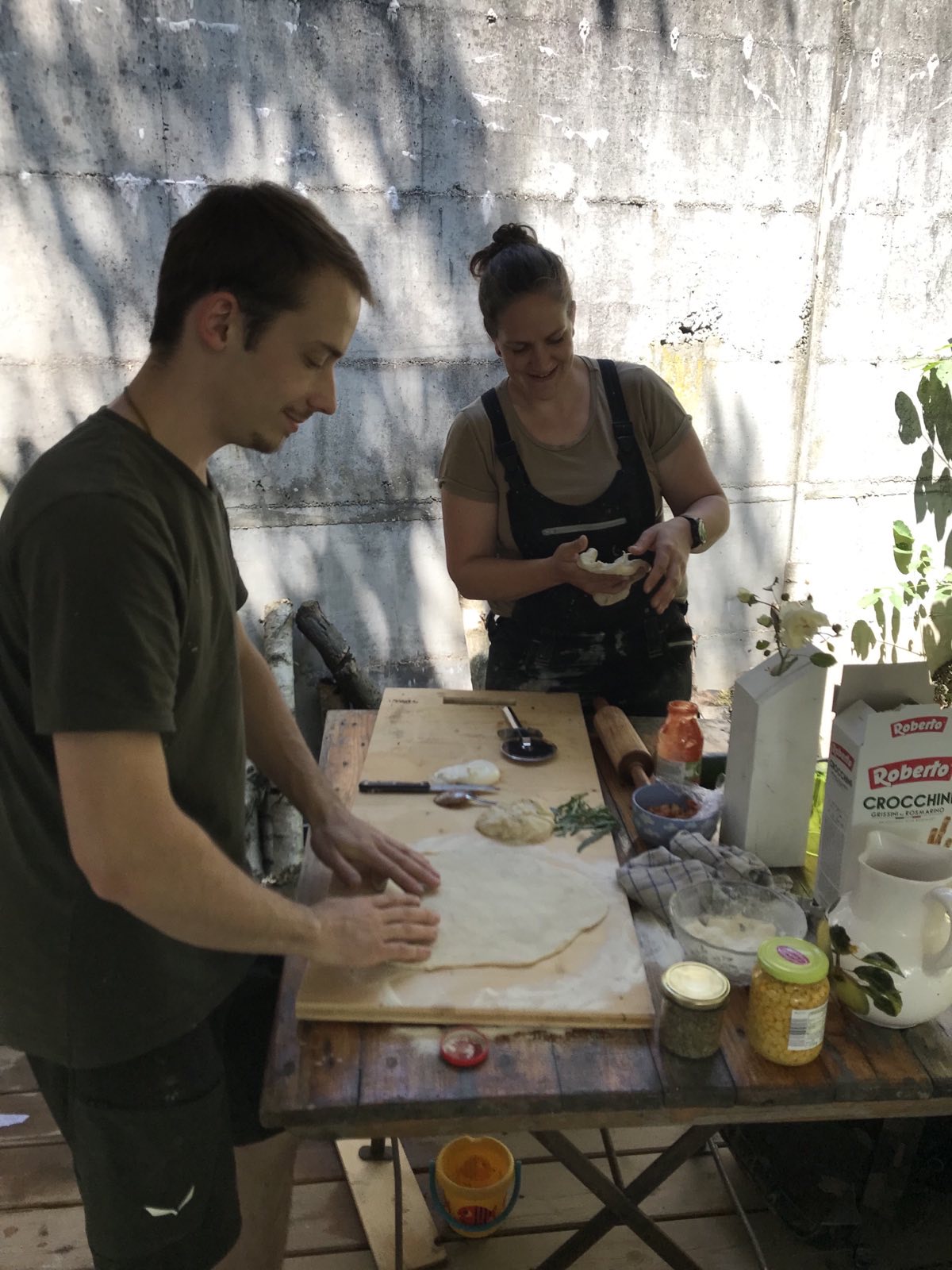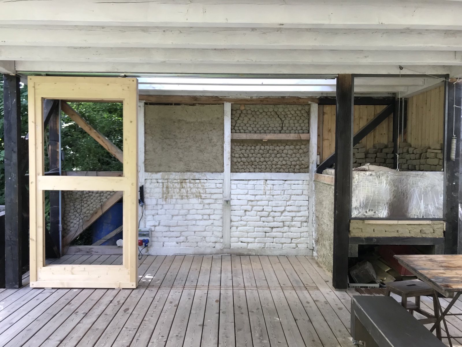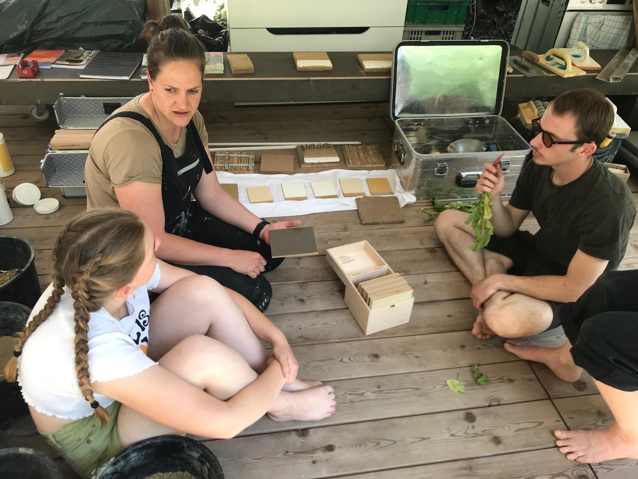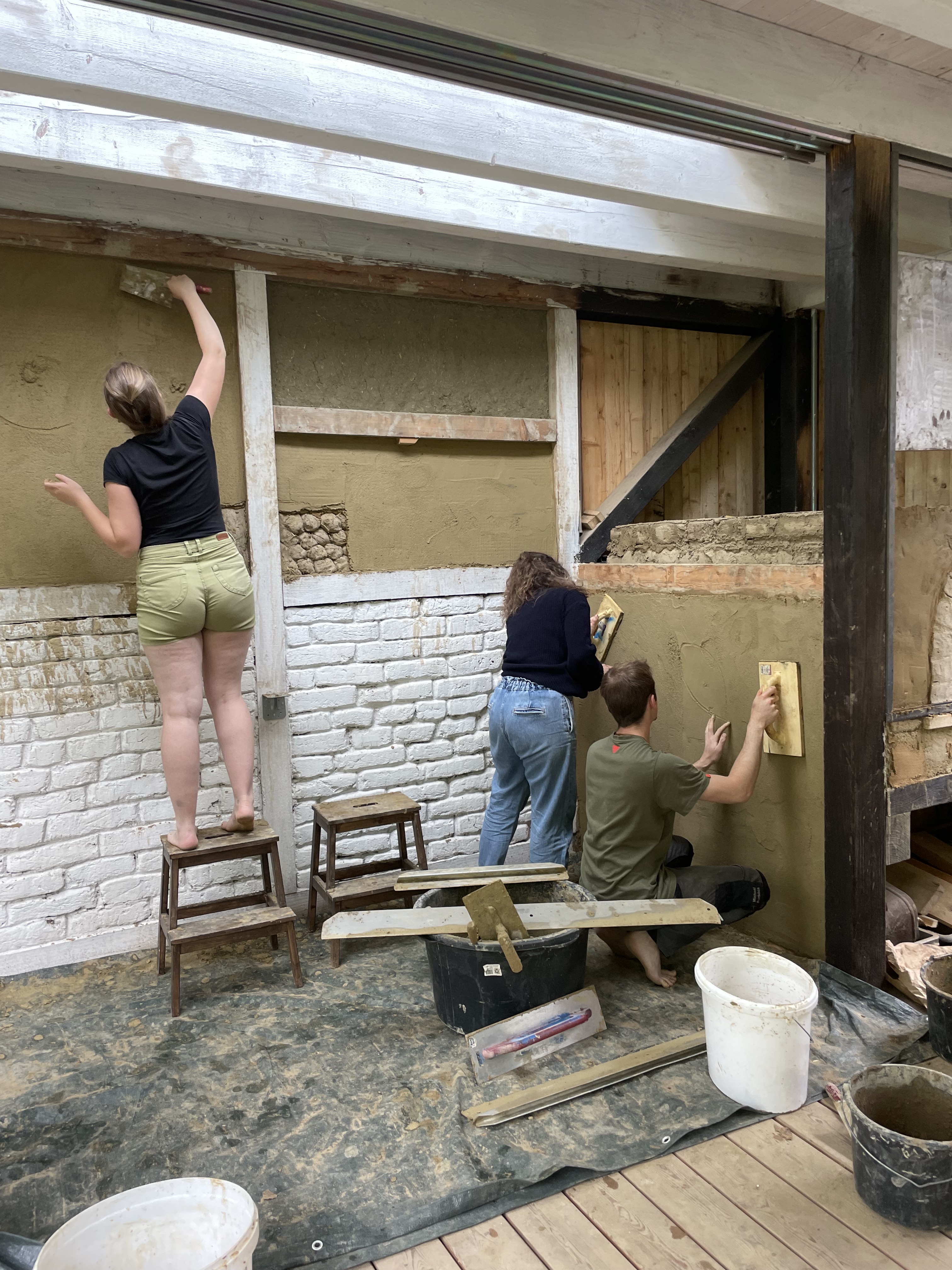 Die perfekte Überleitung zur Materialkunde: Was ist Lehm eigentlich genau? Woraus besteht er und was sind die Besonderheiten? Zwischendurch wurden ersten Mischungen erstellt und aufgetragen. Nach dem Mittagessen – selbstgemachter Pizza aus dem LEHMOFEN! – und einer kurzen Pause ging es schon wieder weiter mit Werkzeugkunde, bevor diese getestet werden konnten. Am Ende des ersten Tags war die erste Putzschicht auf der Wand und viel Theorie in den Köpfen. 🤯