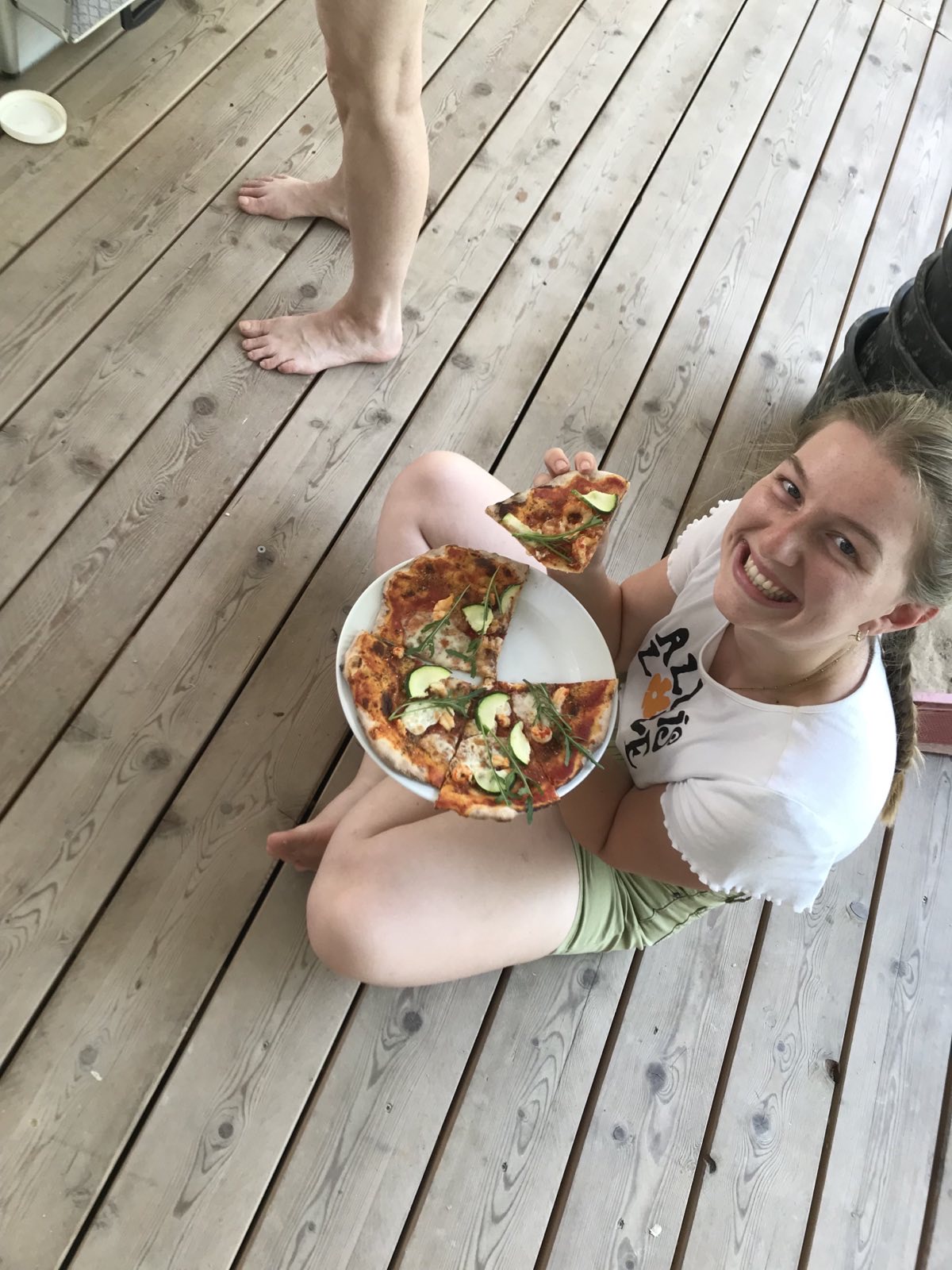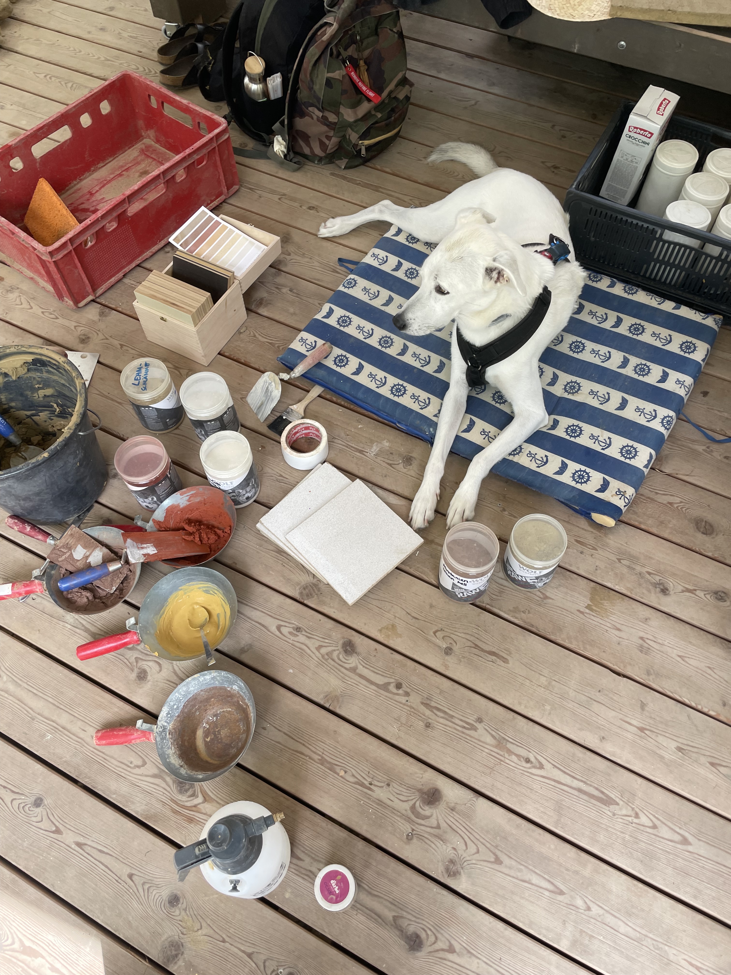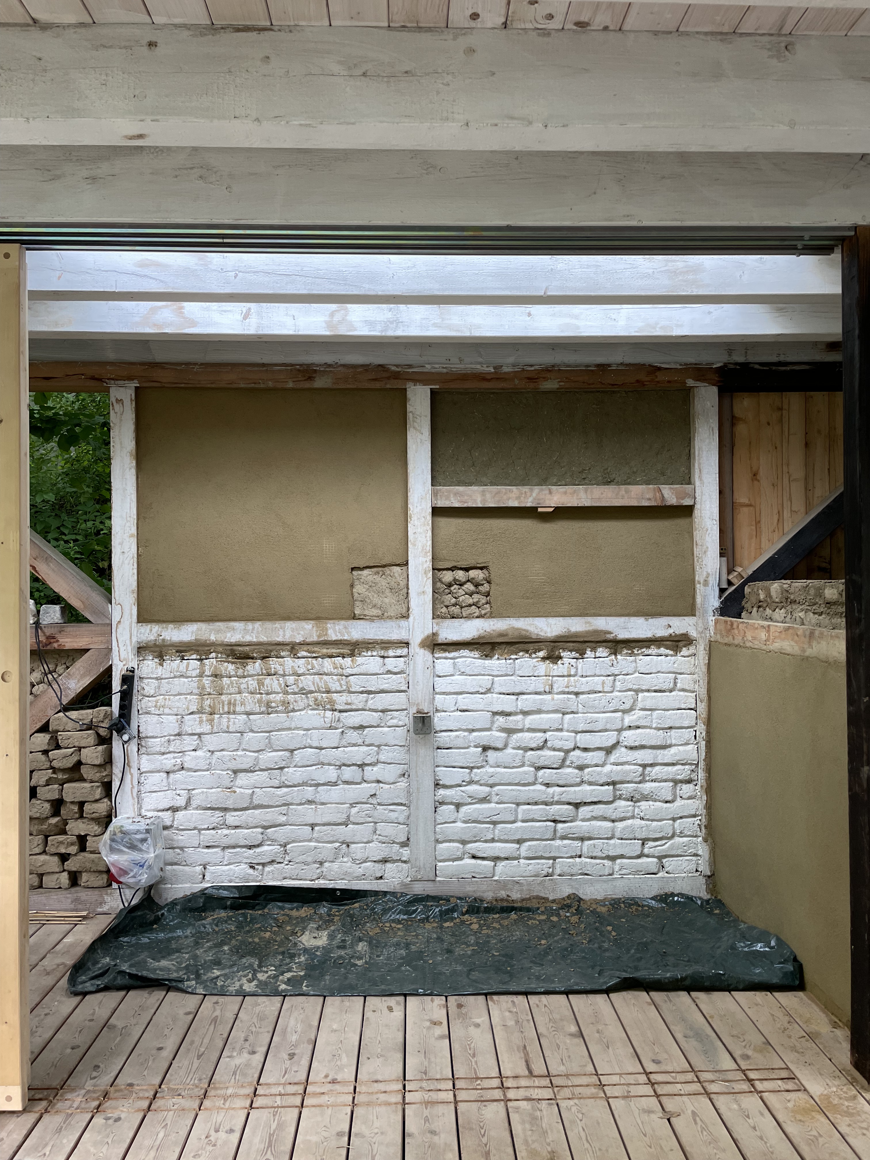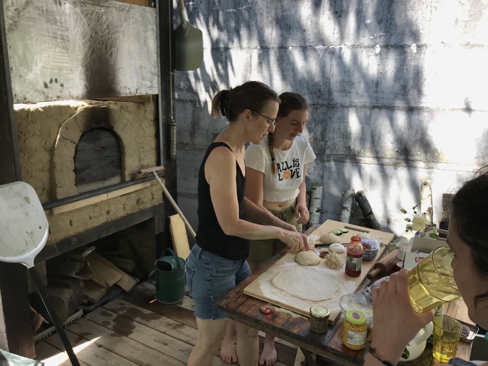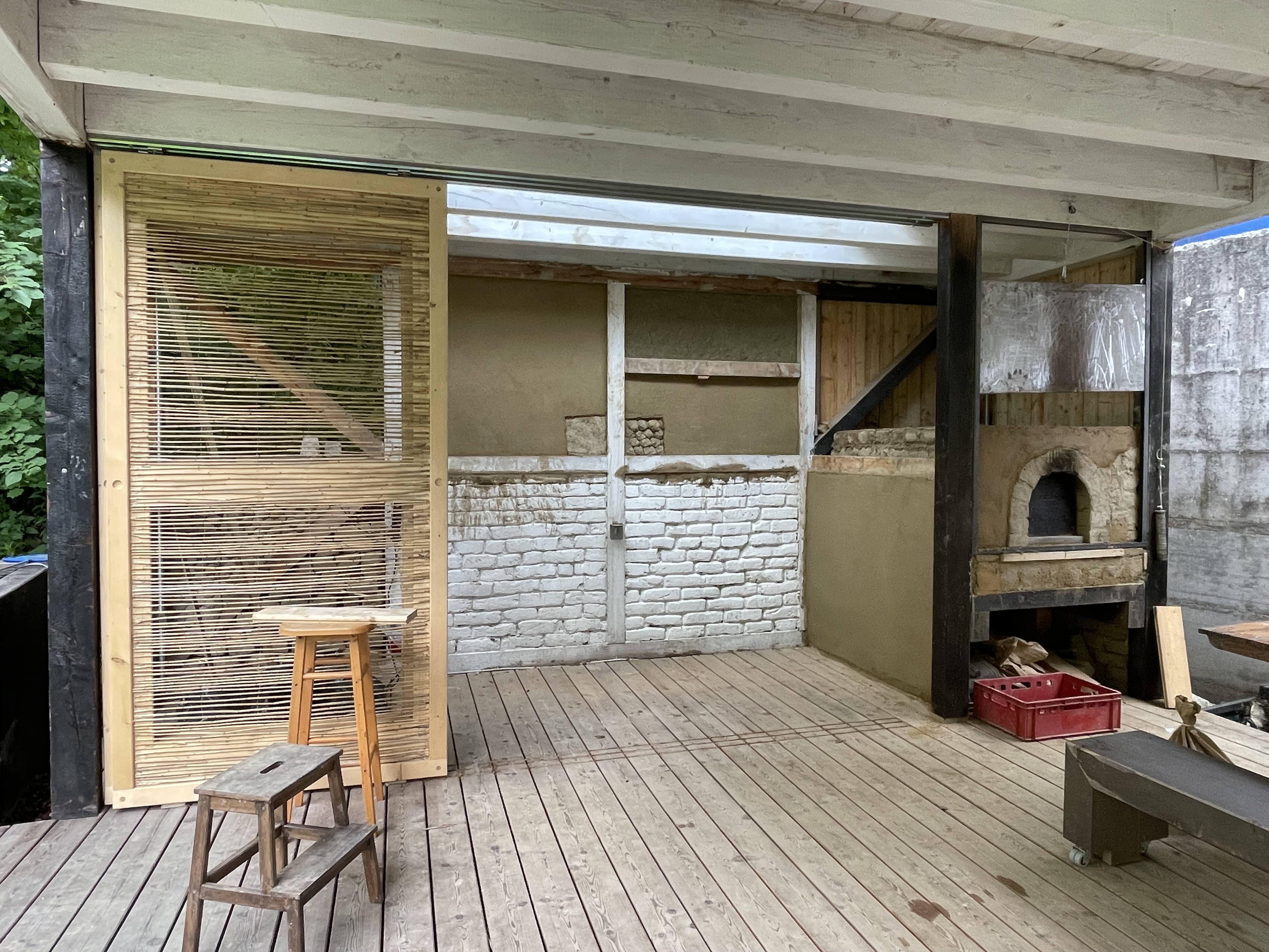 Die perfekte Überleitung zur Materialkunde: Was ist Lehm eigentlich genau? Woraus besteht er und was sind die Besonderheiten? Zwischendurch wurden ersten Mischungen erstellt und aufgetragen. Nach dem Mittagessen – selbstgemachter Pizza aus dem LEHMOFEN! – und einer kurzen Pause ging es schon wieder weiter mit Werkzeugkunde, bevor diese getestet werden konnten. Am Ende des ersten Tags war die erste Putzschicht auf der Wand und viel Theorie in den Köpfen. 🤯