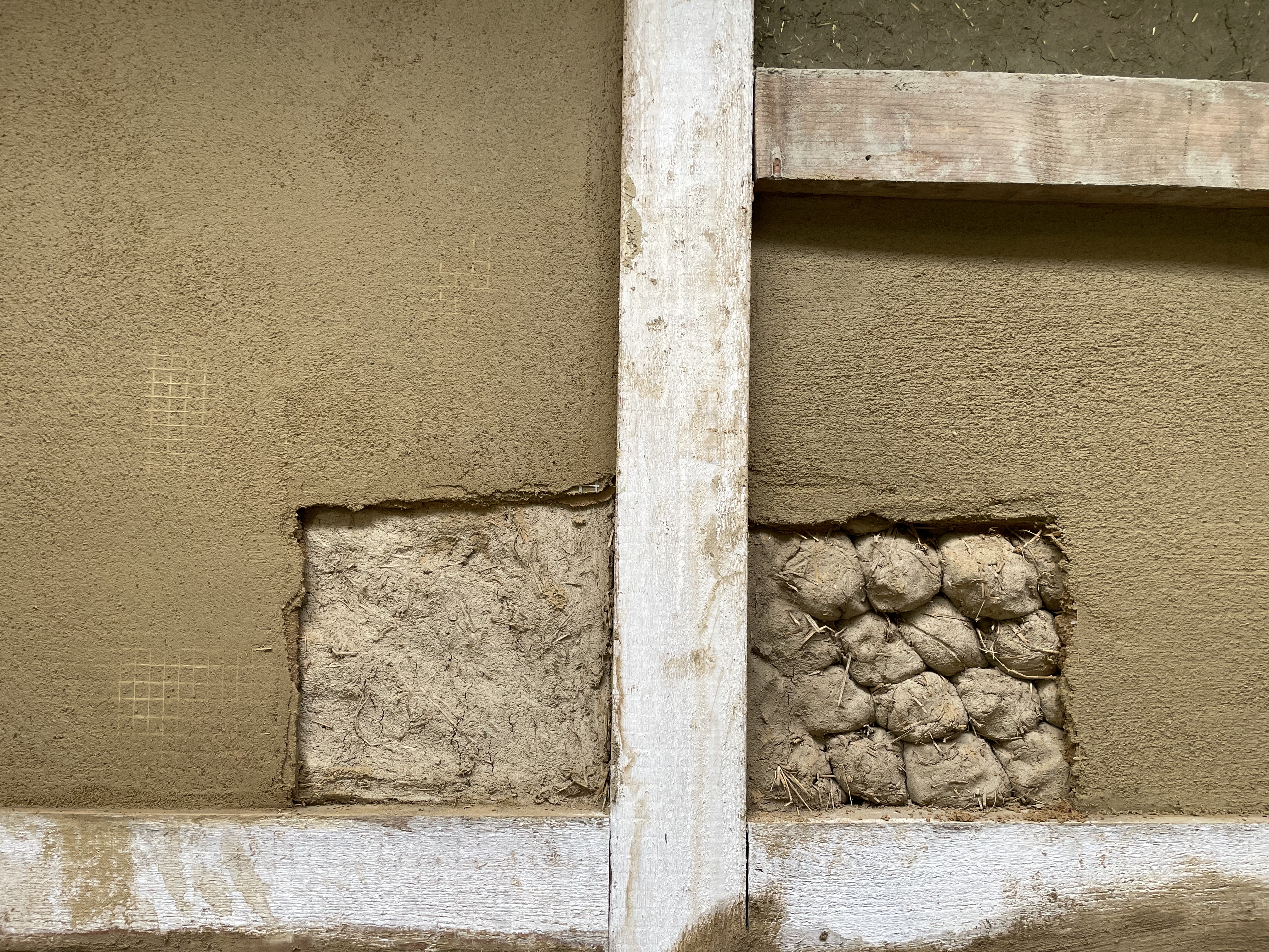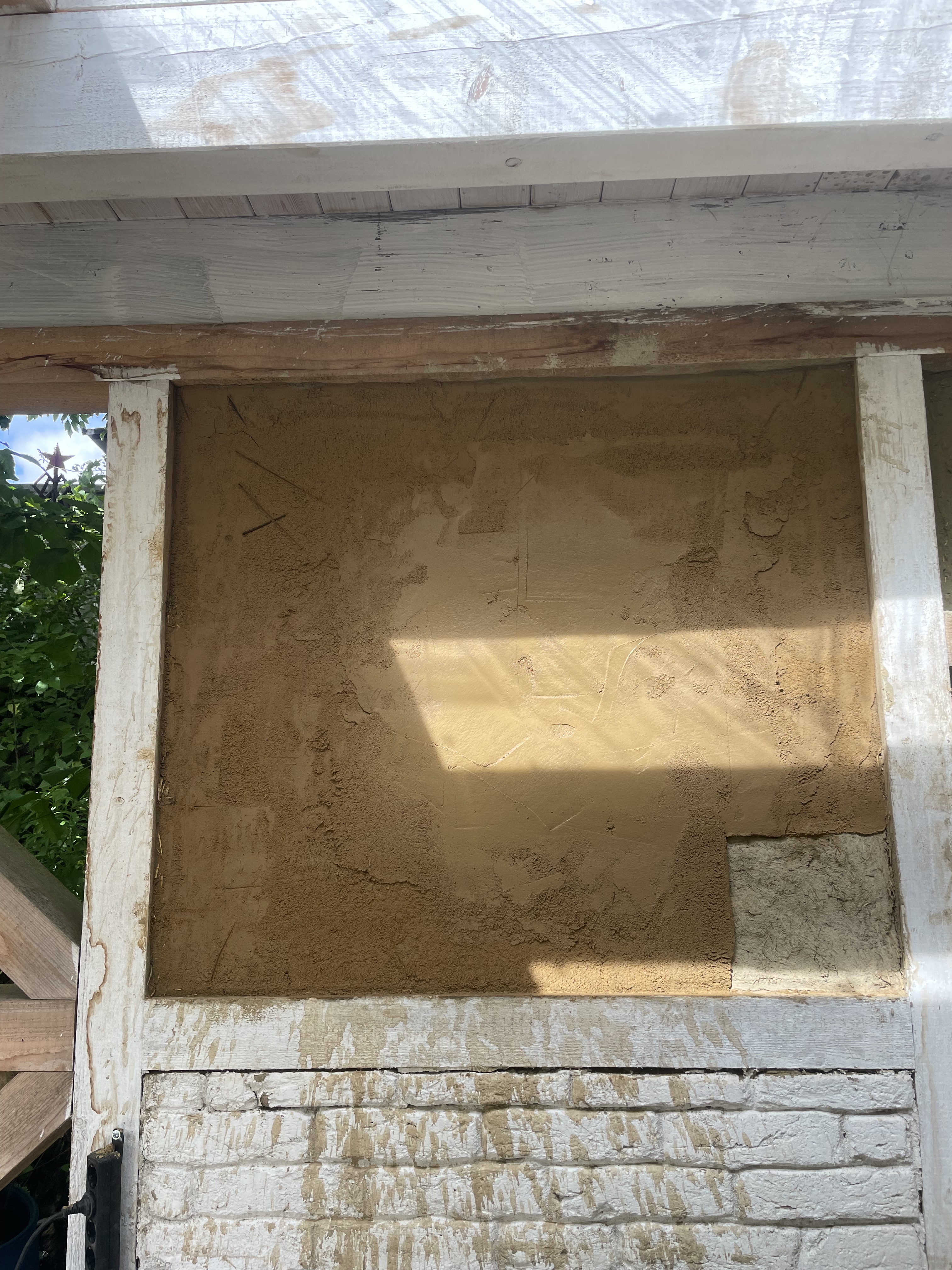 Am zweiten Tag wurde als Erstes eine weitere Ausgleichsschicht aufgetragen und Ausbesserungen vorgenommen. Spontan gab es noch eine „Exkursion“ ins Thema Lehmziegel und Mauern, da über dem Lehmofen noch eine weitere Reihe benötigt wurde. 🤭 Dann ging’s weiter mit Verputzen, der Gewebeschicht, und Muster herstellen, diese durften als Erinnerung mit nach Hause genommen werden. Abschließend wurden noch verschiedene Möglichkeiten der Oberflächengestaltung besprochen und ausprobiert: Reiben, Schwammen, Pinseln, usw.