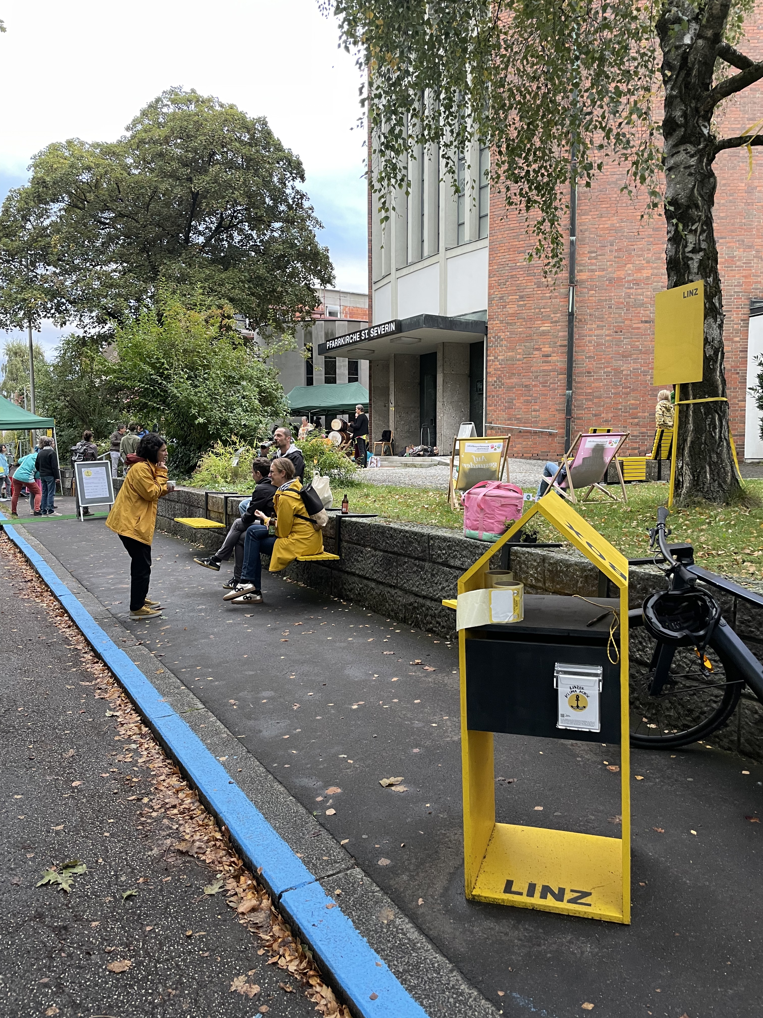 Moussa Kéita inklusive Tanzeinlage von Aminata Kéita. Neue Sitzgelegenheiten entworfen und gebaut von Christine Pavlic erstrahlten in gelb über den Platz vor der Pfarre. Es gab einen Pflanzentauschmarkt, Stände waren da vom Klimabündnis, der Rad-Lobby, der Leisenhofgärnterei, Foodsharing und vielen mehr. Meine Standnachbarin braute zB. tollen Kaffee den sie direkt von Kolumbien bezieht, um die Lieferkette zu verkleinern. Auch die Stadt Linz war da, ein guter Kontakt, da wir immer noch nach Förderungsmöglichkeiten für unsere Lehmwerkstätten in Schulen suchen. (Also wenn ihr was wisst, teilt es uns gerne mit! Danke!)