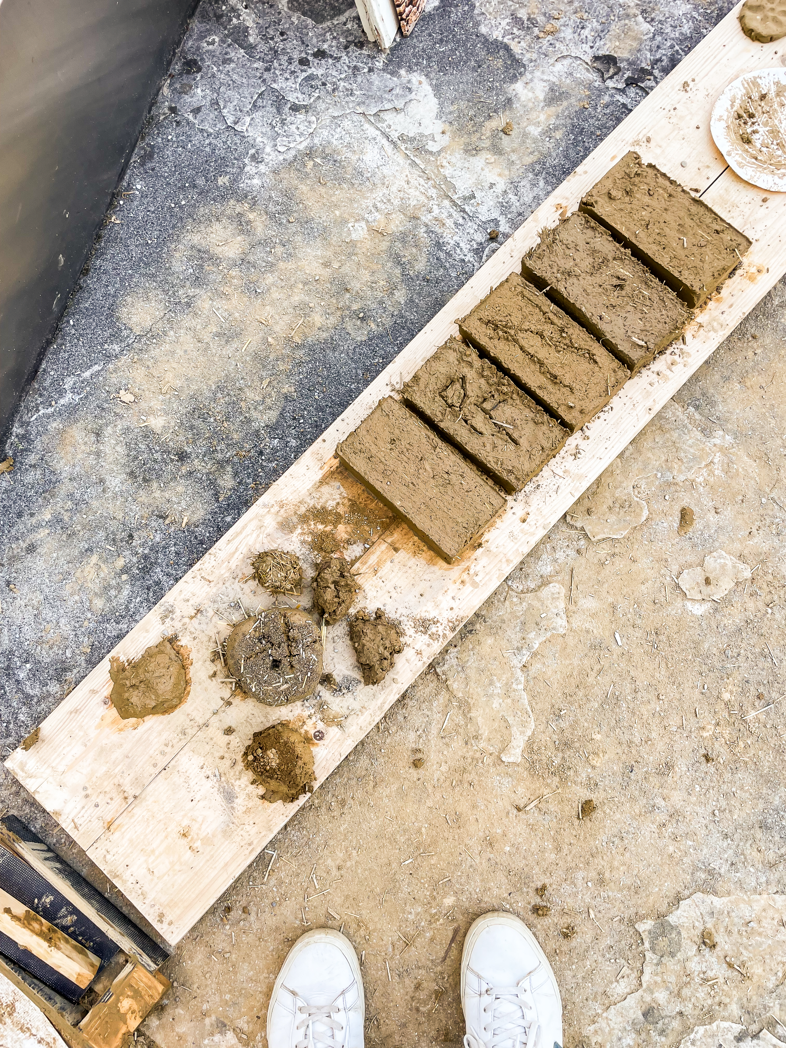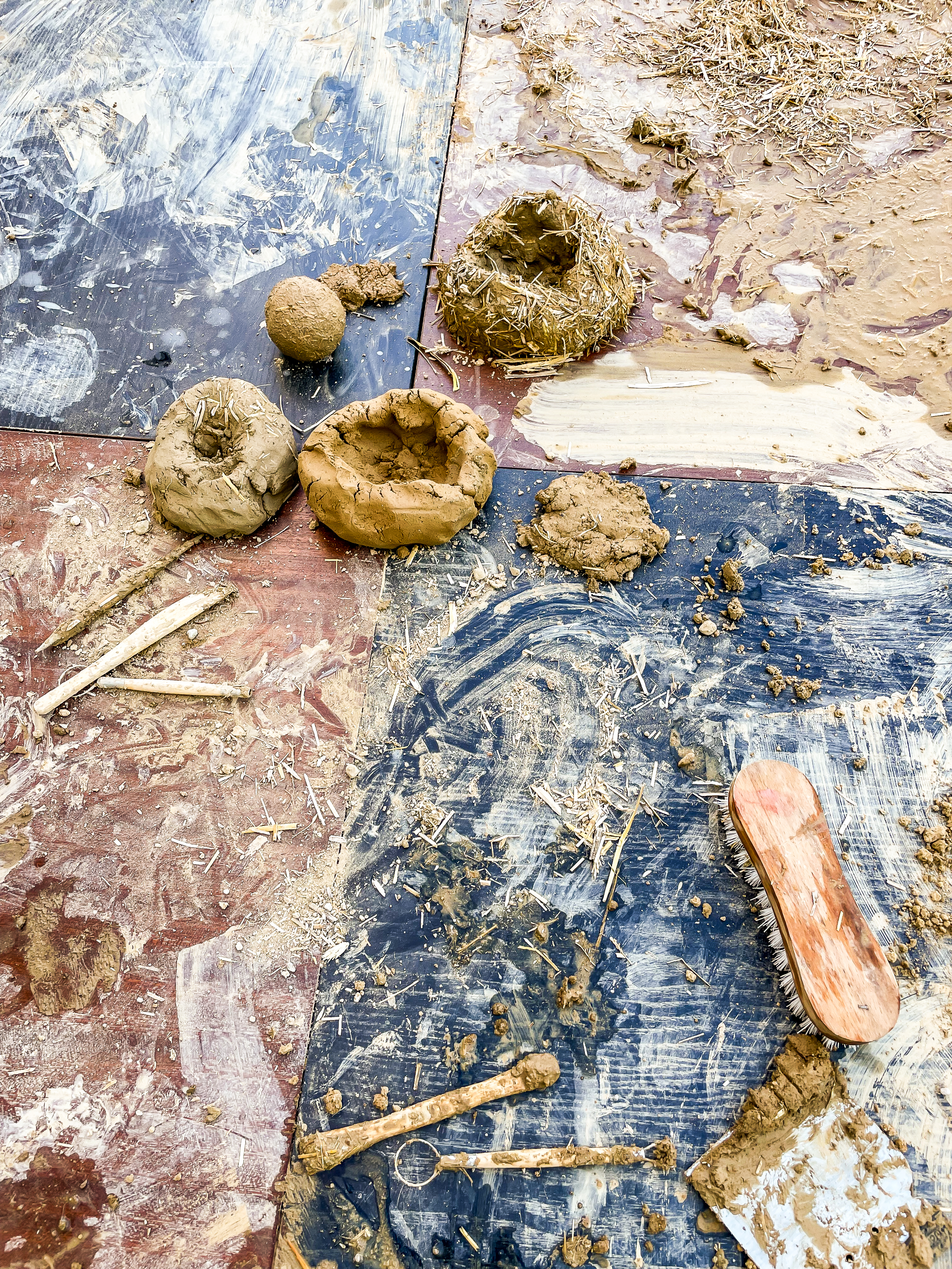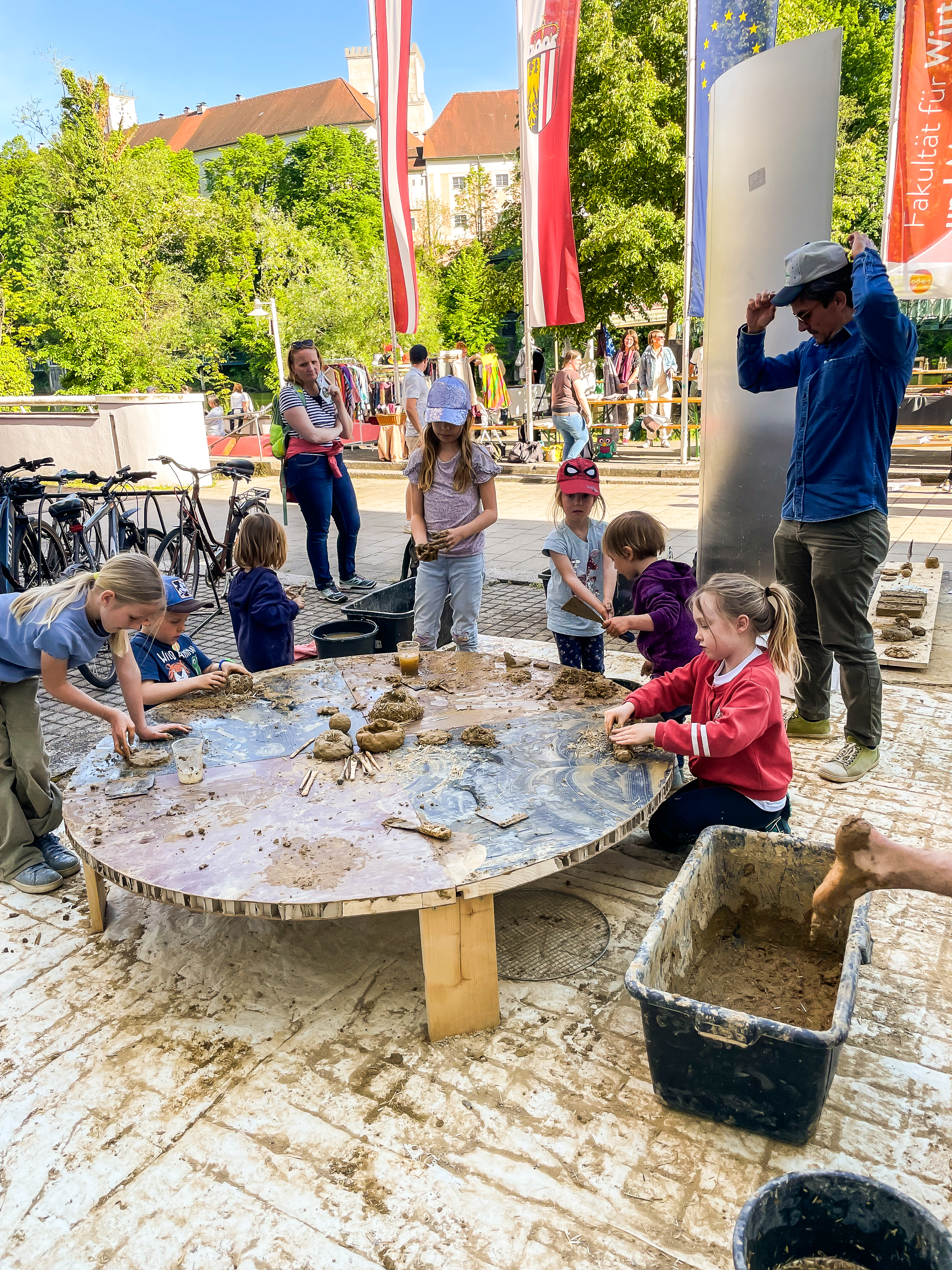 Michi hat einen wunderbaren, kindergerechten Arbeitstisch gebaut und diesen auf den Platz vor der FH gerollt. Das Angebot wurde toll angenommen und die Kinder haben fleißig Ziegeln produziert und Skulpturen gebaut.